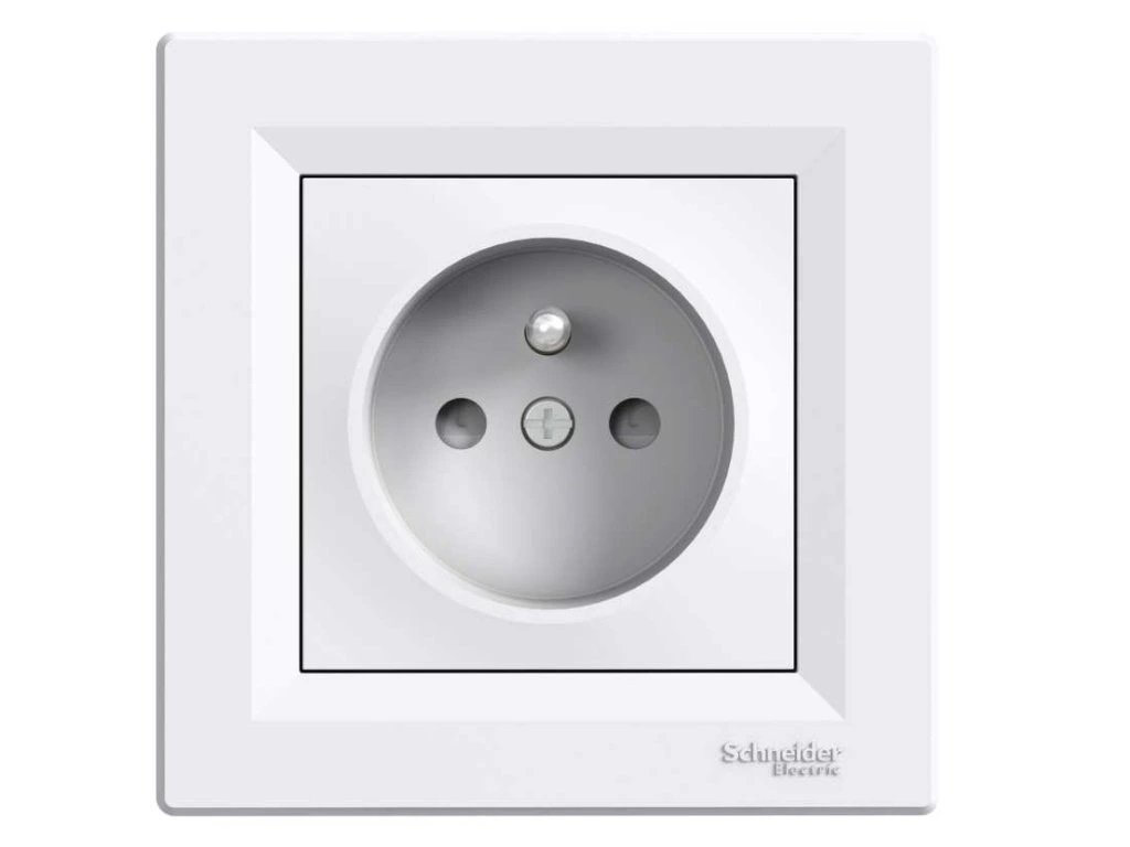 Zásuvka 230V série Schneider Electric ASFORA v bielom prevedení s ochranným kolíkom a bezpečnostnými clonkami (detská ochrana). Vhodná pre domové inštalácie a kompatibilná s rámčekmi série ASFORA.