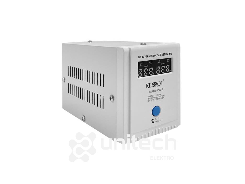 If you need a voltage regulator for devices with high instantaneous starting current, choose a model equipped with the DELAY switch-on delay function. KEMOT SER-1000-S is equipped with a DELAY switch-on delay button in the range of 6 to 180 seconds, which reduces the risk of its damage when devices connected to it have a high instantaneous starting current. In addition, the SER-1000-S stabilizer has protection against too high and too low voltage, overload, overheating and short circuit.