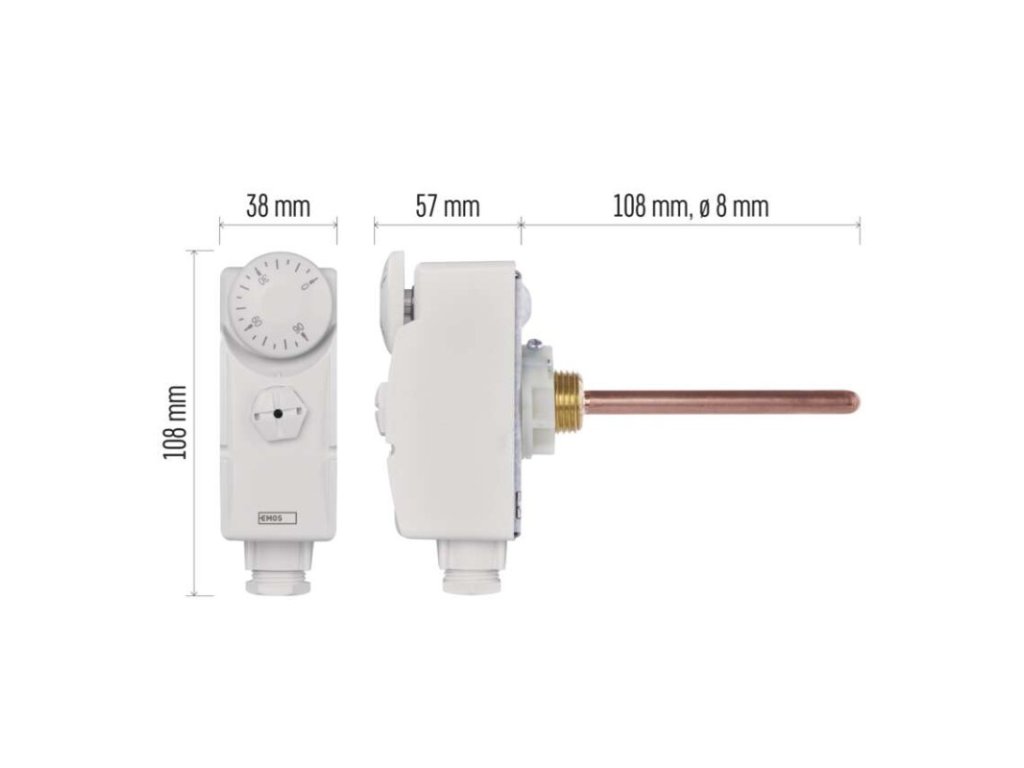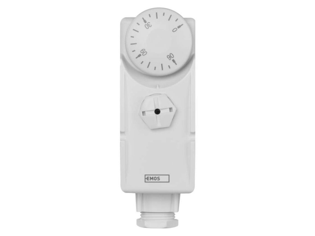 dĺžka kapilárneho čidla: neuvádza sa|dosah vo voľnom priestore: neuvádza sa|druh regulácie: vykurovací a chladiaci systém|farba: biela|funkcia ON/OFF: nie|funkcia prázdniny: nie|funkcia Set-back: neuvádza sa|kalibrácia teploty: nie|meranie teploty: 0 °C až 90 °C|možnosť prepojenia s ďalšími detektormi: neuvádza sa|napájanie: 230 V, 400 V AC|napájanie brány: neuvádza sa|napájanie prijímača: neuvádza sa|napájanie vysielača: neuvádza sa|nastavenie teploty: 0 °C do 90 °C, rozlíšenie 5 °C|nastaviteľný rozptyl teploty: neuvádza sa|ochrana proti zamrznutiu: nie|počet programov: neuvádza sa|podsvietený displej: neuvádza sa|pracovná frekvencia: neuvádza sa|predajný obal: 1 ks, krabička|protokol: –|rozmer: 57 × 38 × 108 mm, jímka: 110 mm, Ø 8 mm, závit 1/2"|rozmer brány: neuvádza sa|rozmer prijímača: neuvádza sa|rozmer vysielača: neuvádza sa|spínaná záťaž: 16 A odporovo, 4 A induktívne|spínanie: napäťové 230 V AC, 50 Hz|súčasť balenia: neuvádza sa|typ nastavenia teploty: neuvádza sa|typ ovládania: manuálny termostat|typ termostatu: drôtový príložnýDodatočné parametre