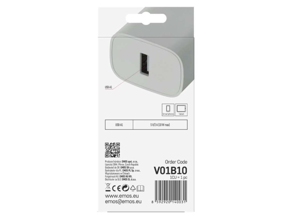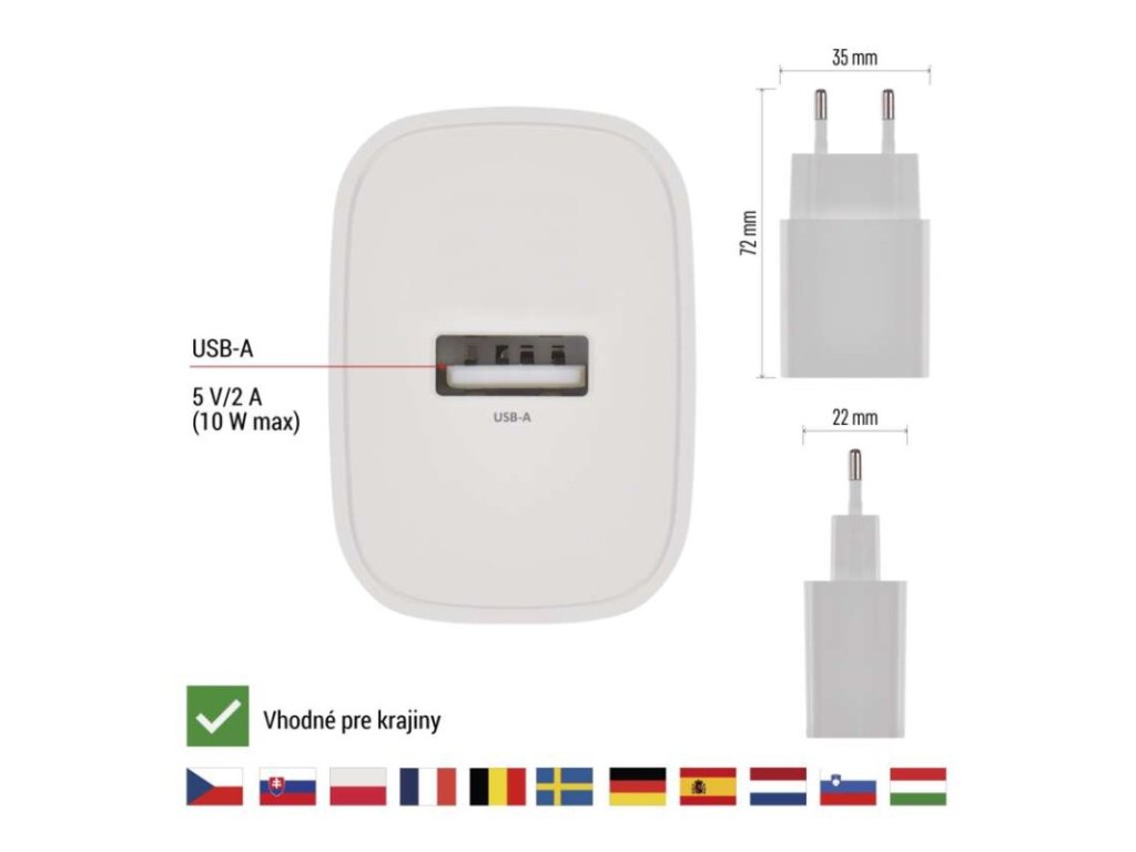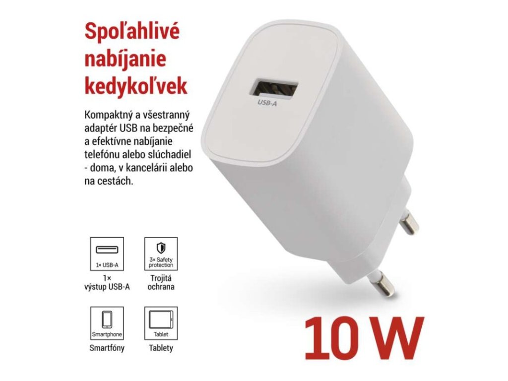 farba: biela|funkcia LED svietidla: neuvádza sa|hmotnosť: 40 g|kábel: nie|kapacita akumulátora: neuvádza sa|kľudový odber prúdu: neuvádza sa|LED indikácia: nie|LED indikátor nabíjania: neuvádza sa|LED indikátor stavu batérie: neuvádza sa|max. výstup 1× USB: A: 5 V/2 A (10 W)|max. výstup celkom: 10 W|max. zaťaženie – stále: neuvádza sa|max. zaťaženie – v špičke: neuvádza sa|nabíjací: basic|ochrana proti preťaženiu, prepätiu a skratu: áno|počet USB výstupov: 1|predajný obal: 1 ks, papierová krabička|produkt: USB adaptér|rozmer: 35 × 72 × 22 mm|rozmer konektora: neuvádza sa|typ batérie: neuvádza sa|typ napájania: neuvádza sa|určené pre: smartphone|vstupné napätie: 100–240 V~ 50/60 Hz|výstupné napätie: neuvádza sa|výstupný prúd: neuvádza saDodatočné parametre