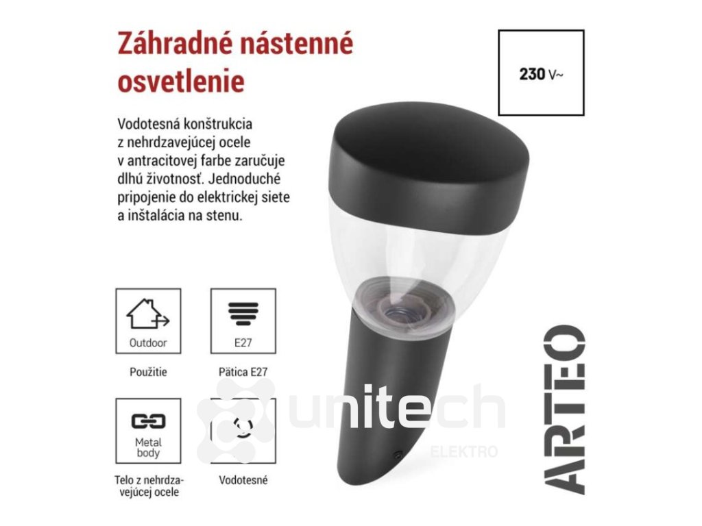 energetická trieda použitého zdroja svetla: –|farba: antracit|farba svetla: –|fotovoltaický článok: nie|frekvencia: 50/60 Hz|index podania farieb (CRI): –|kategória: CLASSIC|krytie: IP44|materiál: nehrdzavejúca oceľ|materiál difúzora: plast|napájanie: 230 V AC|napätie: 220-240 V~|pätica (uchytenie žiarovky): E27|predajný obal: 1 ks, krabička|príkon: –|rada: ARTEO|rozmer: 120 × 120 × 330 mm|rozsah pracovnej teploty: -20 ~ +40 °C|Rozsah snímača PIR: –|senzor PIR: Nie|súmrakový spínač: nie|svetelný tok: –|teplota chromatičnosti: –|vstavaný vypínač: nie|zdroj svetla: –|žiarovka súčasťou balenia: nie|životnosť: –Dodatočné parametre