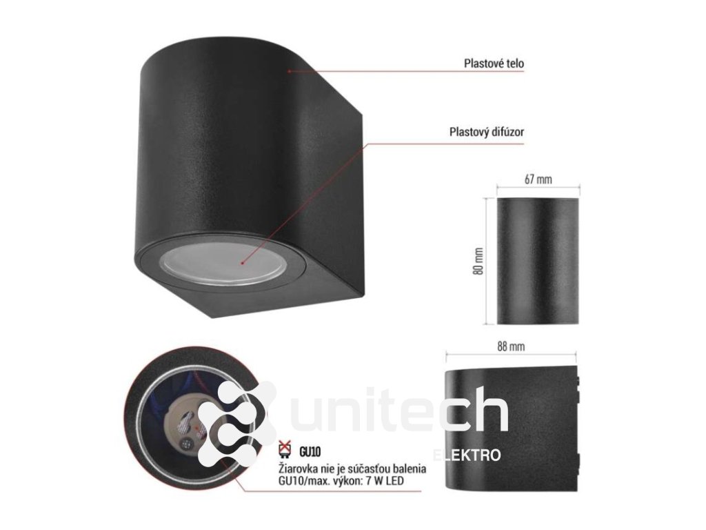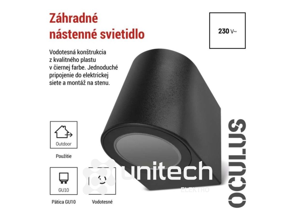 energetická trieda použitého zdroja svetla: –|farba: čierna|farba svetla: –|fotovoltaický článok: nie|frekvencia: 50/60 Hz|index podania farieb (CRI): –|kategória: CLASSIC|krytie: IP44|materiál: plast|materiál difúzora: plast|napájanie: 230 V AC|napätie: 220-240 V~|pätica (uchytenie žiarovky): GU10|predajný obal: 1 ks, krabička|príkon: –|rada: OCULUS|rozmer: 88 × 67 × 80 mm|rozsah pracovnej teploty: -20 ~ +40 °C|Rozsah snímača PIR: –|senzor PIR: Nie|súmrakový spínač: nie|svetelný tok: –|teplota chromatičnosti: –|vstavaný vypínač: nie|zdroj svetla: –|žiarovka súčasťou balenia: nie|životnosť: –Dodatočné parametre