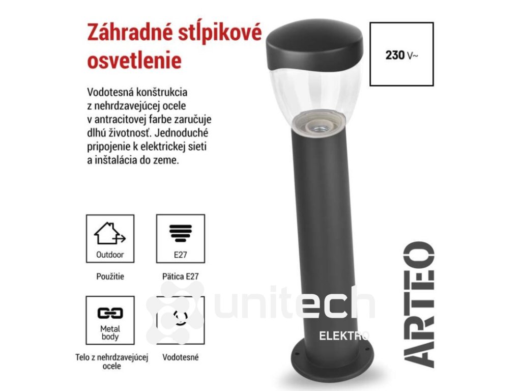 energetická trieda použitého zdroja svetla: –|farba: antracit|farba svetla: –|fotovoltaický článok: nie|frekvencia: 50/60 Hz|index podania farieb (CRI): –|kategória: CLASSIC|krytie: IP44|materiál: nehrdzavejúca oceľ|materiál difúzora: plast|napájanie: 230 V AC|napätie: 220-240 V~|pätica (uchytenie žiarovky): E27|predajný obal: 1 ks, krabička|príkon: –|rada: ARTEO|rozmer: 120 × 120 × 500 mm|rozsah pracovnej teploty: -20 ~ +40 °C|Rozsah snímača PIR: –|senzor PIR: Nie|súmrakový spínač: nie|svetelný tok: –|teplota chromatičnosti: –|vstavaný vypínač: nie|zdroj svetla: –|žiarovka súčasťou balenia: nie|životnosť: –Dodatočné parametre