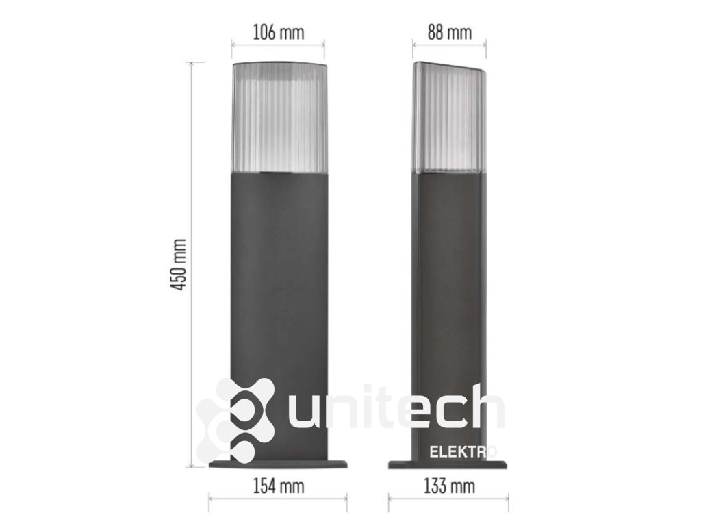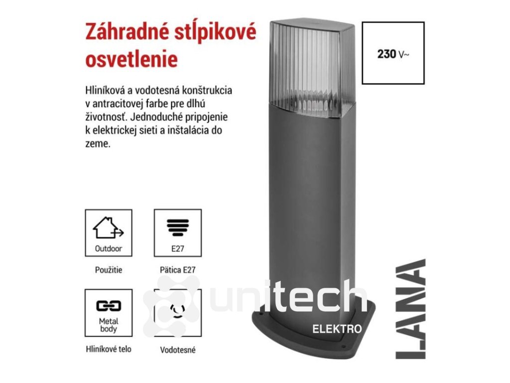 energetická trieda použitého zdroja svetla: –|farba: antracit|farba svetla: –|fotovoltaický článok: nie|frekvencia: 50/60 Hz|index podania farieb (CRI): –|kategória: CLASSIC|krytie: IP54|materiál: hliník|materiál difúzora: plast|napájanie: 230 V AC|napätie: 220-240 V~|pätica (uchytenie žiarovky): E27|predajný obal: 1 ks, krabička|príkon: –|rada: LANA|rozmer: 154 × 133 × 450 mm|rozsah pracovnej teploty: -20 ~ +40 °C|Rozsah snímača PIR: –|senzor PIR: Nie|súmrakový spínač: nie|svetelný tok: –|teplota chromatičnosti: –|vstavaný vypínač: nie|zdroj svetla: –|žiarovka súčasťou balenia: nie|životnosť: –Dodatočné parametre