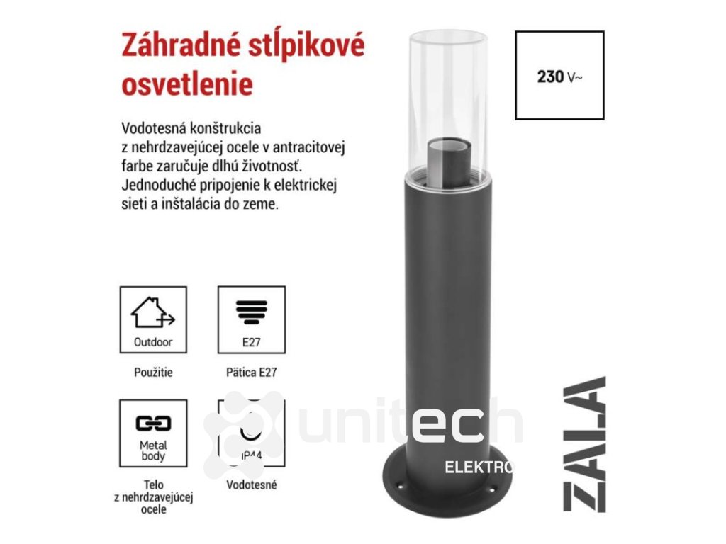 energetická trieda použitého zdroja svetla: –|farba: antracit|farba svetla: –|fotovoltaický článok: nie|frekvencia: 50/60 Hz|index podania farieb (CRI): –|kategória: CLASSIC|krytie: IP44|materiál: nehrdzavejúca oceľ|materiál difúzora: plast|napájanie: 230 V AC|napätie: 220-240 V~|pätica (uchytenie žiarovky): E27|predajný obal: 1 ks, krabička|príkon: –|rada: ZALA|rozmer: 140 × 140 × 500 mm|rozsah pracovnej teploty: -20 ~ +40 °C|Rozsah snímača PIR: –|senzor PIR: Nie|súmrakový spínač: nie|svetelný tok: –|teplota chromatičnosti: –|vstavaný vypínač: nie|zdroj svetla: –|žiarovka súčasťou balenia: nie|životnosť: –Dodatočné parametre
