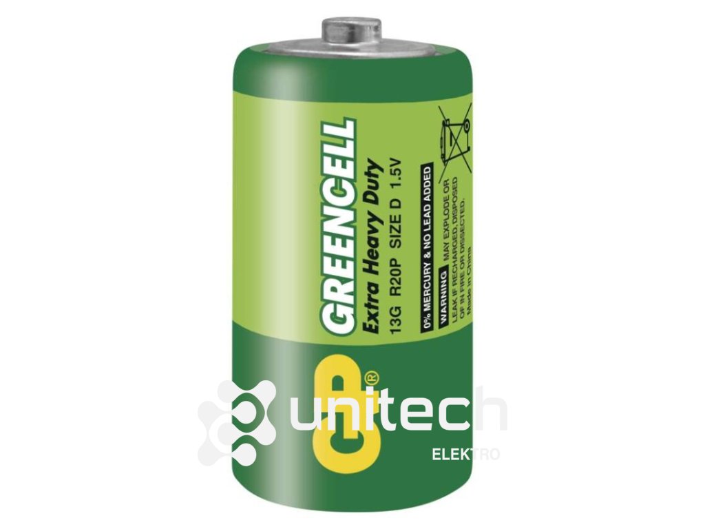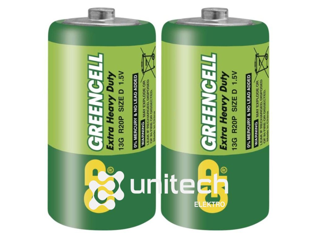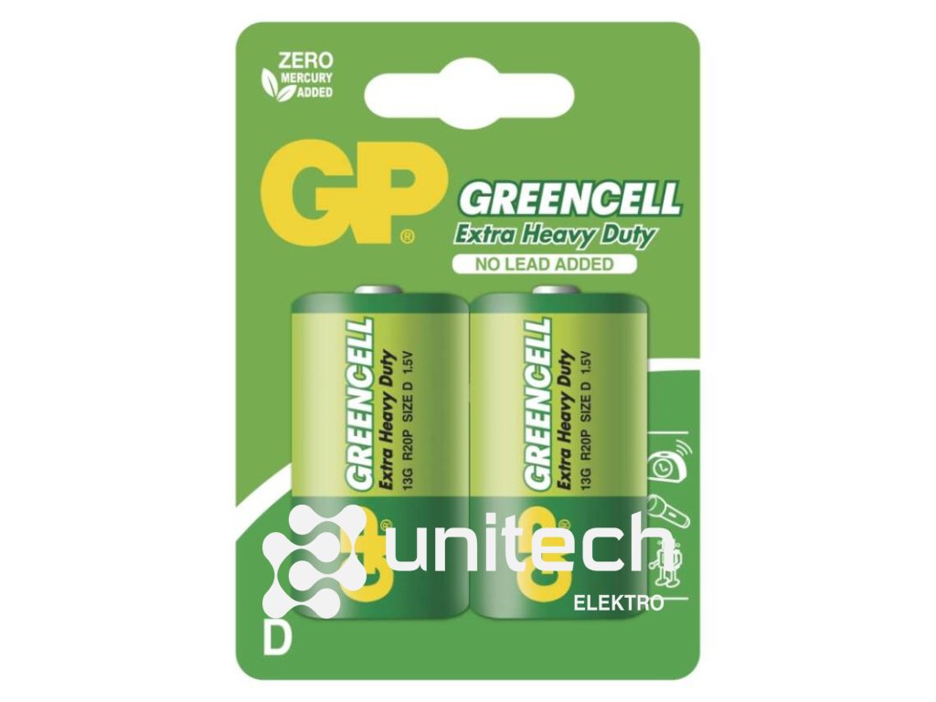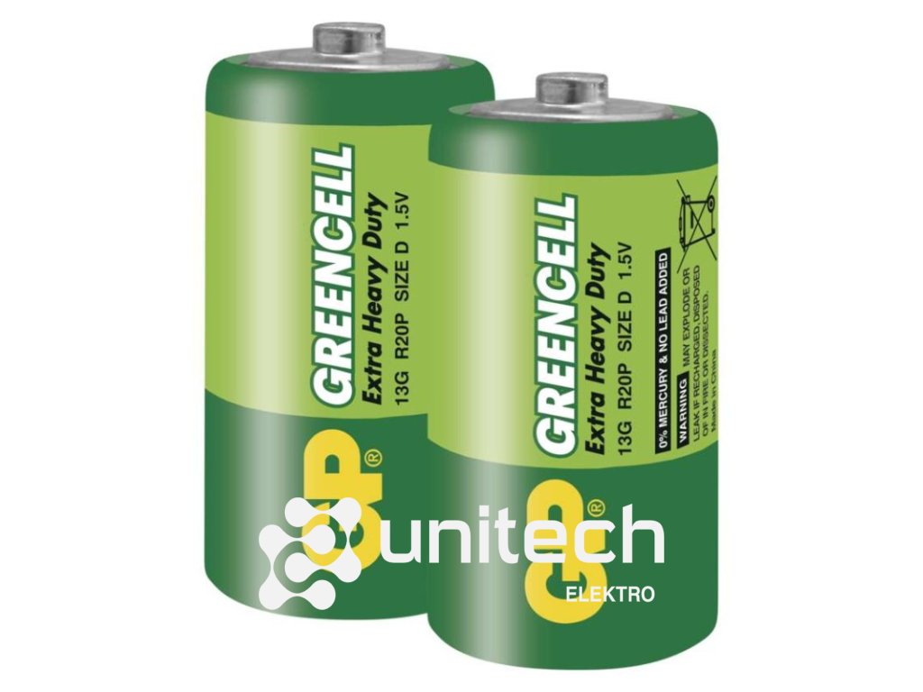 chemické zloženie: zink-chloridové|hmotnosť: 97 g|kapacita: neuvádza sa|kategória/rada: Greencell|max. skladovateľnosť: 3 roky|možnosť nabíjania: nie|napätie: 1,5 V|počet nabíjacích cyklov: nenabíjacie|predajný obal: 2 ks, blister|prevádzková teplota: 0 °C až +45 °C|rozmer: 34,2 × 61,5 mm|typové označenie: R20 (veľké mono, D)|veľkosť batérie: D|značka: GPDodatočné parametre