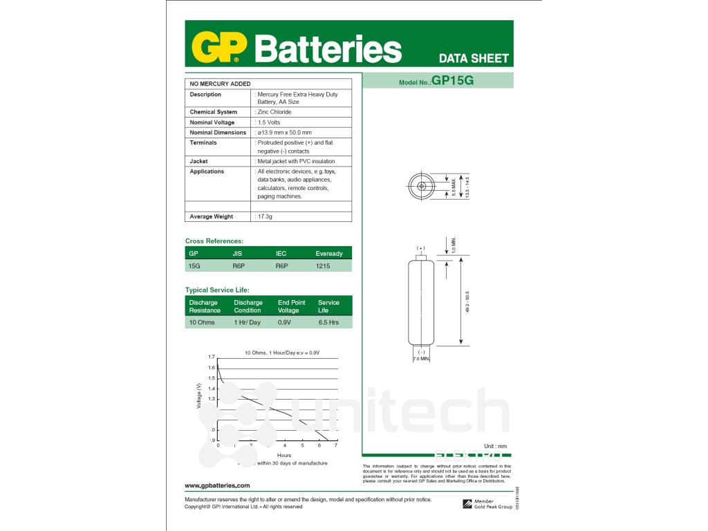 chemické zloženie: zink-chloridové|hmotnosť: 17,3 g|kapacita: neuvádza sa|kategória/rada: Greencell|max. skladovateľnosť: 3 roky|možnosť nabíjania: nie|napätie: 1,5 V|počet nabíjacích cyklov: nenabíjacie|predajný obal: 12 ks, fólia|prevádzková teplota: 0 °C až +45 °C|rozmer: 14,5 × 50,5 mm|typové označenie: R6 (tužka, AA)|veľkosť batérie: AA|značka: GPDodatočné parametre