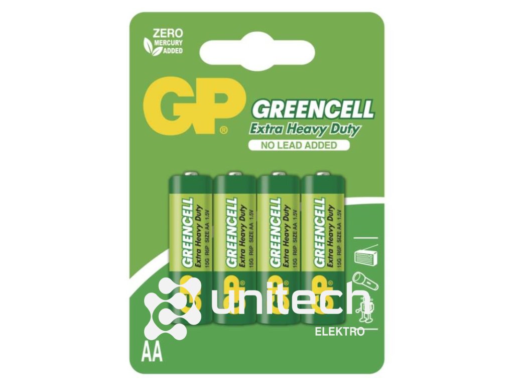 chemické zloženie: zink-chloridové|hmotnosť: 17,3 g|kapacita: neuvádza sa|kategória/rada: Greencell|max. skladovateľnosť: 3 roky|možnosť nabíjania: nie|napätie: 1,5 V|počet nabíjacích cyklov: nenabíjacie|predajný obal: 4 ks, blister|prevádzková teplota: 0 °C až +45 °C|rozmer: 14,5 × 50,5 mm|typové označenie: R6 (tužka, AA)|veľkosť batérie: AA|značka: GPDodatočné parametre