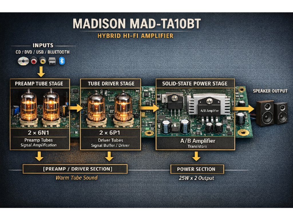 Madison MAD‑TA10BT obsahuje elektrónky (vákuové trubice) ako súčasť zosilňovacej sekcie: