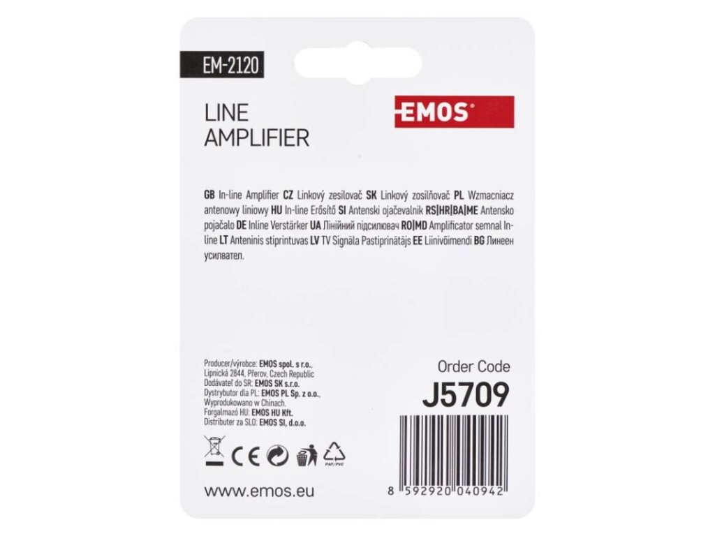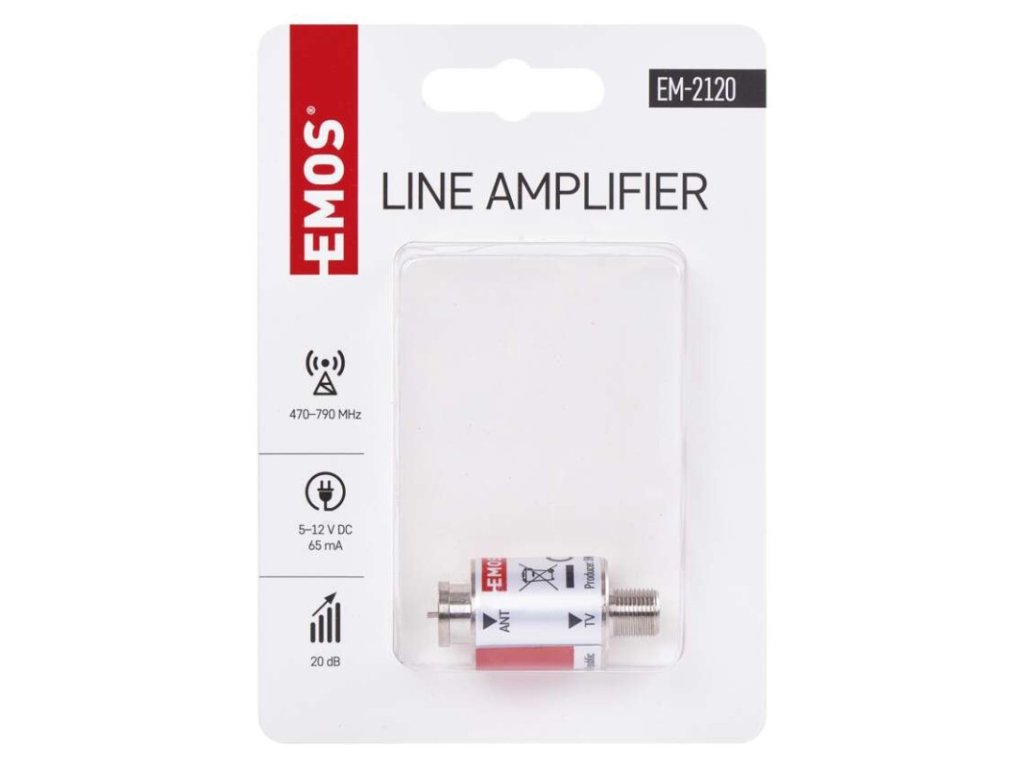 5G filter: nie|frekvenčný rozsah: 470–790 MHz|izolácia medzi vstupmi: neuvádza sa|konektory: F konektor|krytie: IP45|LTE filtr: áno|maximálna úroveň signálu na výstupe: 104 dBµV|napájanie: 5–12 V DC, 65 mA|počet vstupov: 1|počet výstupov: 1|potlačené pásmo: 790–2 200 MHz|predajný obal: 1 ks, headercard|priechodná pre jednosmerné napájanie predzosilňovačov: nie|produkt: tienený linkový zosilňovač|regulácia zisku: nie|rozmer: 20 × 42 mm|rozteč dier: neuvádza sa|šumové číslo: <2,0 dB|útlm v potlačenom pásme: neuvádza sa|vstupy: F konektor|zosilnenie: 20 dBDodatočné parametre