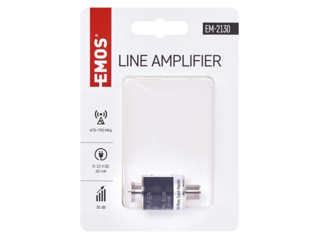 5G filter: nie|frekvenčný rozsah: 470–790 MHz|izolácia medzi vstupmi: neuvádza sa|konektory: F konektor|krytie: IP45|LTE filtr: áno|maximálna úroveň signálu na výstupe: 104 dBµV|napájanie: 5–12 V DC, 65 mA|počet vstupov: 1|počet výstupov: 1|potlačené pásmo: 790–2 200 MHz|predajný obal: 1 ks, headercard|priechodná pre jednosmerné napájanie predzosilňovačov: nie|produkt: tienený linkový zosilňovač|regulácia zisku: neuvádza sa|rozmer: 20 × 42 mm|rozteč dier: neuvádza sa|šumové číslo: <2,0 dB|útlm v potlačenom pásme: neuvádza sa|vstupy: F konektor|zosilnenie: 30 dBDodatočné parametre